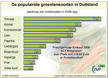Tomaten, wortelen en komkommers waren ook in 2008 de meest populaire groenten in Duitsland. Ook de volgorde in de rest van de top-10 is onveranderd gebleven ten opzichte van voorgaande jaren.