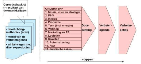 Onderstaand het proces van de Groeiversterker. In de blauwe boxen zijn de zaken weergegeven die generiek werden ontwikkeld en als leidraad dienen bij de doorlichting. De middelste twee procesblokken zijn de feitelijke ingrediƫnten van de Groeiversterker, namelijk de doorlichting van alle functionele gebieden en de verbeteragenda. De verbeteragenda is de agenda van de ondernemer zelf waarin staat welke projecten op welke termijn worden uitgevoerd, projecten gericht op de ontwikkeling van management en organisatie.