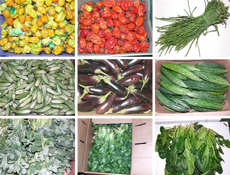 Van links naar rechts, van boven naar beneden: Adjoema (Oeganda), Cayenne (Oeganda),Kouseband (Dominicaanse Republiek), Okra (Suriname), Bhatta (Suriname),Sopropo (Suriname), Methi (Cyprus), koriander (Cyprus) en wildespinazie (Cyprus).