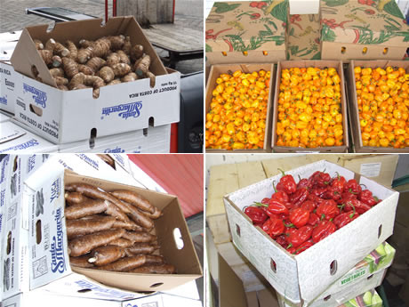 Vanaf linksboven met de klok mee: eddoes (Costa Rica), gele pepers (Dominicaanse Republiek, Yuca's (Costa Rica) en rode pepers (Dominicaanse Republiek)