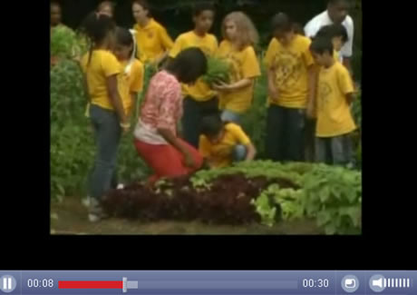 Samen met enkele schoolkinderen heeft Michelle Obama in de aarde lopen wroeten. De First Lady heeft een moestuin aangelegd in de tuinen van het Witte Huis. Daarin heeft ze verschillende groenten gezaaid om kinderen bewust te maken van het eten van gezond voedsel. Dinsdag konden de groenten geoogst worden.