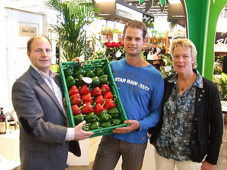 Marco Hanemaaijer (midden) toont zijn vitale paprika's, geflankeerd door Remy Mosch en Ineke Moerman van Acqua Universo
