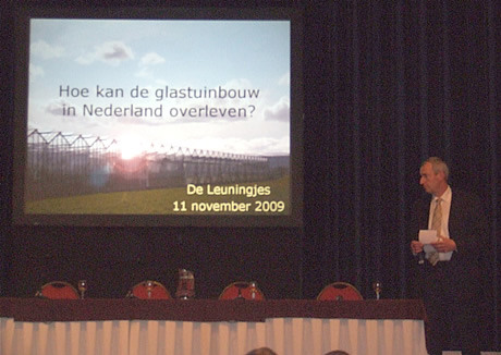 Het symposium werd afgerond met een forumdiscussie met in het panel prof. dr. Wim de Ridder, wethouder Theo Duijvestijn, Meiny Prins (Priva), Berend Jan Taken (Essent) en Theo Ammerlaan. "Er ligt een enorme lijst om de situatie in de glastuinbouw te verbeteren", vatte Meiny Prins de visie samen. "Maar geen enkele consument betaalt meer voor een duurzaam product. Sterker nog, ze krijgen het vaak niet eens aangeboden! Wat mij betreft heeft het stimuleren van samenwerking, marketing en ketenintegratie nu prioriteit. Andere zaken zoals meer kostenbesparing en technologie zijn ook heel belangrijk, maar die komen vanzelf wel."