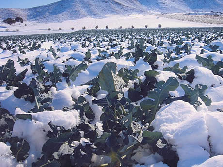 Tholen - Vandaag kleurt Nederland wit, maar ook in Spanje viel er eerder deze week al sneeuw. In Murcia nabij Lorca werden de groentenvelden bedekt met een witte laag sneeuw. Verdi Import ontvangt momenteel volop groenten uit Spanje. Het gaat voornamelijk om aubergines, broccoli, courgettes, ijsbergsla, komkommers en paprika's. De sneeuw heeft gevolgen voor de groententeelt. Henk Rozema van Verdi import vertelt dat een groente als broccoli echter wel wat kan hebben.