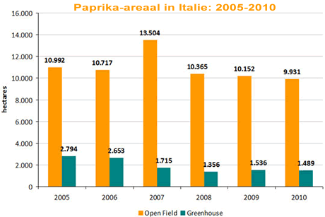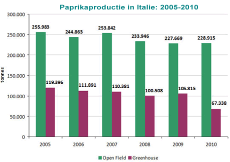 Volgens het Italiaans Nationaal Instituut voor de Statistiek (Istat) kwam de Italiaanse paprikaproductie in 2010 uit op 296.253 ton, een daling van 11% ten opzichte van 2009. Het Italiaanse paprika-areaal daalde vorig jaar met 2,3% tot een totaal van 11.420 hectare.