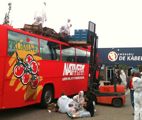 Het reclamebureau vervoert de tomaten per bus naar Valencia. Tijdens de twintig uur durende bustrip worden onderweg kratten met tomaten op het dak geladen om niet met lege handen aan te komen in het Spaanse dorpje. Niemand minder dan Arie Boomsma is er bij aanwezig.