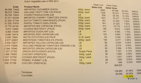 Verkoop Nederlandse groenten op weekbasis. Tomaten en komkommers zijn goed voor respectievelijk 47% en 24% van de verkoopwaarde van alle Nederlandse groenten.