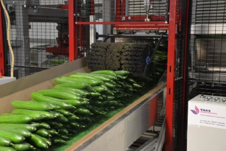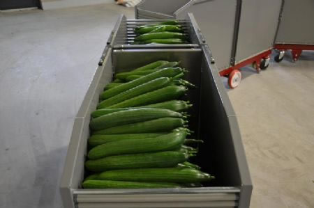 Tholen - Taks Tuinbouwtechniek heeft samen met Twan Prinse van Kwekerij De Lindenborg uit Breda een nieuw oogstsysteem voor komkommers ontwikkeld. "Met de traditionele manier van oogsten, gaat er veel arbeid verloren bij het omstapelen van de gele kisten. We hebben daarom naar een oplossing gezocht met een oogstcontainer, waarbij de komkommers op een eenvoudige manier erin gelegd konden worden, binnen reikwijdte van een arm en waarbij de inhoud voldoende is om een padlengte van circa 100 meter te kunnen oogsten", vertelt directeur Cor Taks in deze videoreportage.De oplossing werd gevonden in de vorm van een beweegbare bodemplaat, waardoor tijdens het oogsten de komkommers eerst vooraan weggelegd kunnen worden. Vervolgens worden deze naar achteren geschoven om de inhoud van de container te vergroten, waardoor het mogelijk is om 250 tot 275 komkommers in één container te leggen. Voor dit principe van het vergroten van de inhoud van de container door middel van de verschuifbare bodemplaat met achterplaat is octrooi aangevraagd.