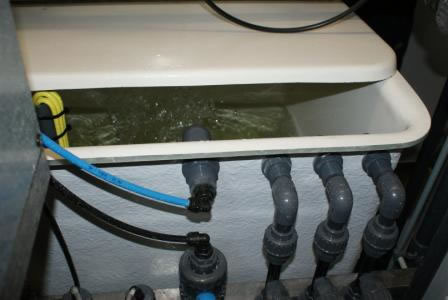 Het water druppelt vrij op de nieuwe goot (tusen twee planten in) en loopt via de planten door naar de oorspronkelijke draingoot.