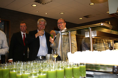 Als slok op de borrel had Henk voor de komkommertelers ook nog een verrassing in petto. Hij heeft een bevriende top-chef, Moshik Roth, namelijk een paar drankjes laten ontwikkelen op basis van komkommer en Henk heeft volgende maand een gesprek bij Starbucks of ze naast koffie ook mogelijk gezonde drankjes willen verkopen. Henk vroeg de tuinders of ze mee wilden doen, wat zorgde voor een hoop handen in de zaal.