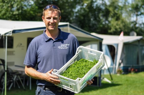 Het is een drukke dag voor Hubrecht Janse als ik een bezoek breng aan het boerenerf van de familie aan de Zuid-Bevelandse oever van het Veerse Meer. Hubrecht is druk met de huisverkoop van de zeekraal en daarnaast houdt hij zich ook nog eens bezig met het welbevinden van de vele campinggasten die hun vakantie doorbrengen op de landschapscamping. Zijn broer is zojuist met de combine aan het eerste perceel tarwe begonnen. “Wat een drukte hè met dit mooie weer”, zegt Hubrecht tussen de bedrijven door. “Op een zonnige dag als vandaag weten er behoorlijk wat mensen de weg naar onze boerderij te vinden voor hun zakje zeekraal.”