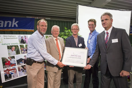V.l.n.r: Peter Vermeulen, Theo Ammerlaan (juryleden Nature Counts), Wridzer en Jan-Willem Bakker (BioBakker VOF) en Arie van der Linden (directeur Kwaliteit & Milieu The Greenery).