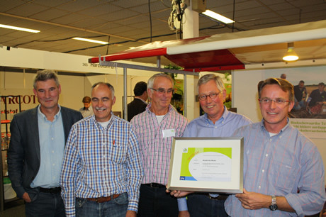 Dick Meulblok reikt de eerste prijs uit voor de gevestigde handel aan Wim Landwaart