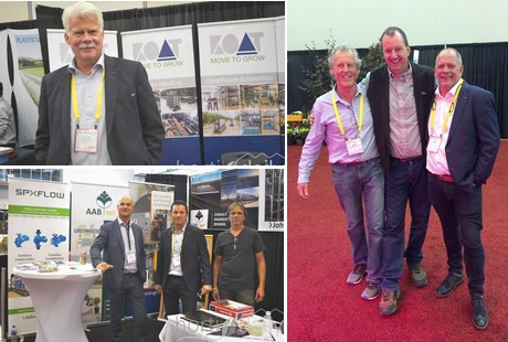 Linksboven: Kees van Dam van KOAT, rechtsonder Arwin van der Wees van SPX Flow Technology, Rene Caron (AAB International) en Herman Verboom (HT Verboom Transportystemen) en rechts drie oude bekenden: Arie van der Giessen van Backyard Farms, Arie Alblas van Roelands Plant Farms & Arie Barendrecht van Viscon. Met al die Nederlanders komt de naam Arie verrassend weinig voor en ze worden regelmatig verward!