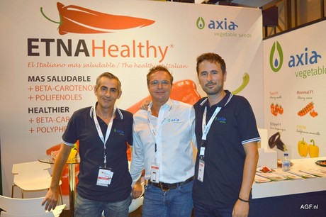 Mattias Verdu, Michel de Winter en Elias Munoz van Axia Vegetable Seeds. Zij promootten de Etna Healthy, de nieuwe zoete paprika in het assortiment van Axia.