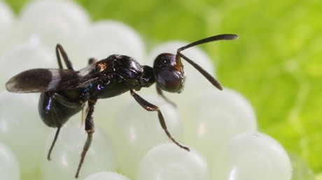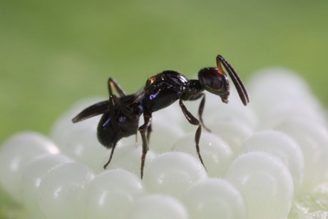 Anastatus bifasciatus op de eitjes van Aziatische wantsen