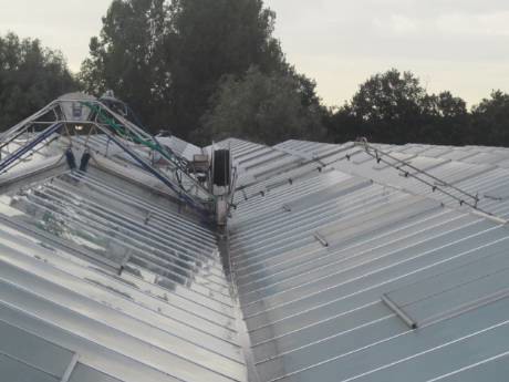 De hal voor de paprikakas is gevuld met reinigingsmachines. Charles legt met het gemak van een kenner uit hoe de apparaten steunen op de kasgoten en voorzichtig maar grondig de kasdekken reinigen. Verschillende schoonmaakmiddelen staan opgestapeld langs de wanden. Daarmee is Dekcleaning Service niet alleen in staat om de kas na het zomerseizoen krijtvrij te maken, maar kan het bedrijf ook algen verwijderen en de lichtinval in de kas weer optimaliseren.