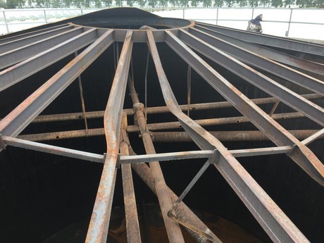 Hans begint: “Begin maart concludeerden we een lekkage van stikstof bovenin de tank die dienstdoet als expansievat.” Een blik op het dak leerde echter dat er iets anders aan de hand was. Het dak was ingezakt. Er werd een belletje gepleegd naar Calor Holland, dat zich bezighoudt met ontwerp, installatie en onderhoud van kasverwarmingsinstallaties. Zij zagen algauw dat het ging om implosie van de tank. “Waarschijnlijk is er iets met de beveiliging niet goed gegaan. Door drukverschillen met een zekere wateromslag ontstond er een vacuüm die de spanten krom heeft getrokken.”