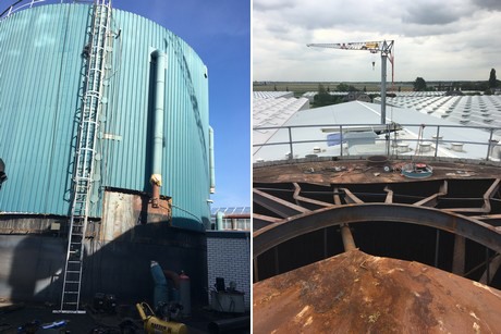 Om deze klus te klaren werd SJR Greenhouse tanks er als derde partij bij gehaald. Net als Calor ook een relatief jonge partij, sinds 2017 onderdeel van de SJR Group, dat voorheen bekend was als Sloot Tankbouw. Dit bedrijf specialiseert zich sinds 1961 in de bouw van warmteopslagtanks over de hele wereld. “Dit was geen alledaagse klus voor ons”, vertelt André Stougje. “Dat kwam met name doordat de tank ingeklemd staat door de kassen en een schuur. De enige toegang vormde een deur van 90 cm bij twee meter. Te smal voor een kraan.”