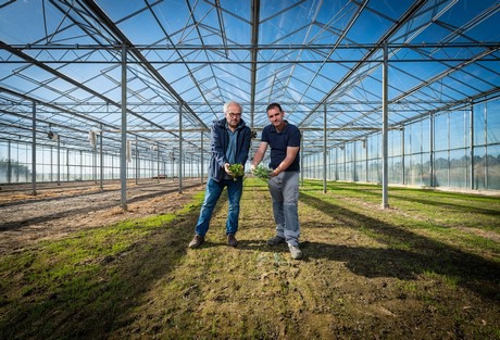 Hans Elenbaas en Aart Jan Bil telen zeegroenten in de kas.