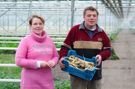Janneke en Cees Klootwijk in de kas. Cees heeft zojuist een verse bestelling met pastinaak geoogst.