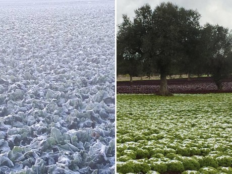 De weersituatie in de voorheen 'veilige' teeltgebieden van Italië en Spanje worden steeds extremer. Italië kampt met behoorlijke sneeuwval, Spanje deels met vorst. Ook als het slechts een korte vorst- of sneeuwperiodes betreft, zijn de gevolgen al te merken in de groothandel. Bij de huidige oogst komt het tot kwaliteits- en oogstverlies, vooral bij de gevoelige slasoorten. Telers en handelaren maken zich zorgen over de rest van het seizoen.