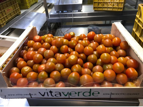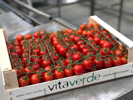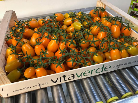 Vita Verde - dat zich puur specialiseert in de im- en export van Italiaanse groenten - krijgt de tomaten twee keer per week vers aangeleverd vanuit Siciliƫ. Nieuw dit jaar is dat het bedrijf een proef heeft met vier verschillende soorten gele, oranje, bruine en rode cherrytomaten in een houten krat. "De houten verpakking geeft een authentieke look en daar krijgen we veel goede feedback op. Het product verkoopt zichzelf", zegt Frits. "Volgend jaar hopen we hierin weer verder te groeien."