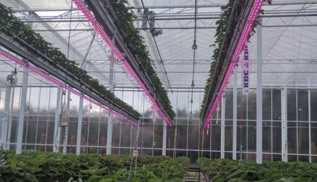 In Hoogstraten worden dit najaar voor het eerst aardbeien geteeld in een vierlagensysteem. Onder de drie bovenste goten hangen dimbare leds die het lichtverlies op de onderste goten compenseren. Afgelopen jaren werden bij Proefcentrum Hoogstraten al proeven uitgevoerd met teelt in een tweelagensysteem met belichting.