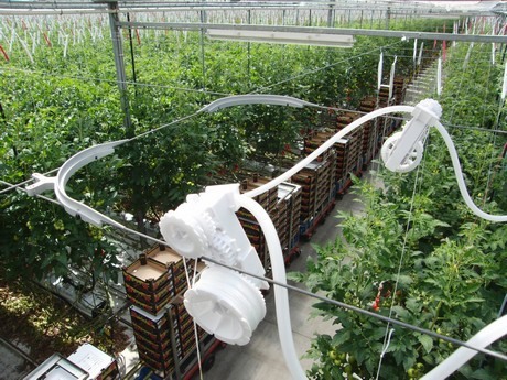 De werking van het systeem doet denken aan het tikken van een klok. Een compressor met één bar pompt luchtdruk in een transparante ringleiding. Die ringleiding loopt door kunststof katrollen die aan de bestaande hogedraad zijn gehangen. Twee pompbewegingen zetten de katrol in werking waardoor de draad één centimeter zakt én het gewas tegelijkertijd één centimeter opschuift. Dit alles computergestuurd met behulp van een regelkast die het mogelijk maakt dat de teler zelf precies in kan stellen wanneer het gewas zakt en opschuift.