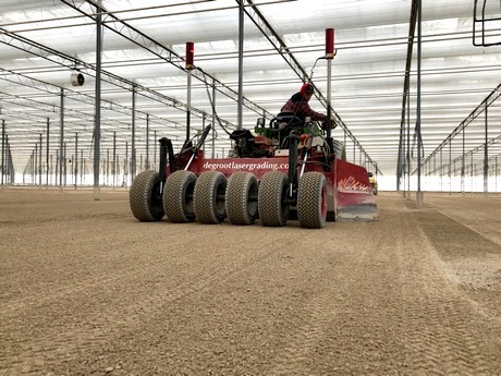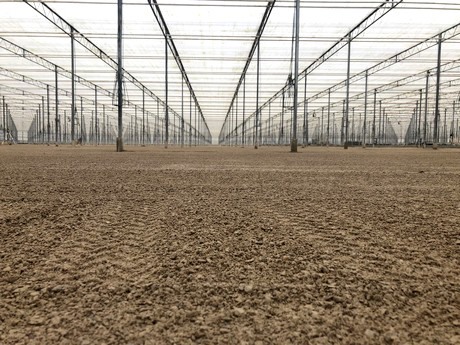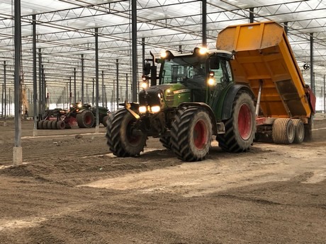 Bij een normaal egalisatieproces wordt het oppervlak van de grond losgemaakt en weer vastgedrukt. "Omdat we al het water tegenwoordig recirculeren en er geen water meer in de grond belandt, was de grond zo hard en uitgedroogd dat we nieuw materiaal moesten toevoegen. Om het allemaal weer netjes glad te krijgen, werd er 4.000 ton fijn grind de kas in gedreven. Als je het niet zou weten, zou je het niet zeggen - maar het is nu helemaal egaal.