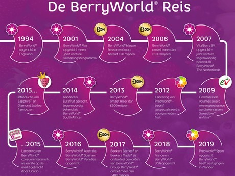 "Het bedrijf heeft zich in 25 jaar ontwikkeld tot een expert op diverse disciplines binnen de markt. Zo biedt BerryWorld exclusieve, toonaangevende rassen aardbeien, frambozen, blauwe bessen en bramen die voldoen aan de verwachtingen van de consument op het gebied van smaak. BerryWorld Group heeft inmiddels vestigingen in 7 landen, maar de kernwaarden van het bedrijf zijn grotendeels gelijk gebleven. Zo wordt er veel waarde gehecht aan duurzame relaties met de telers en staat eigen veredeling van exclusieve rassen centraal, evenals de expertise op het gebied van het vermarkten van zacht fruit en voorgesneden fruit.