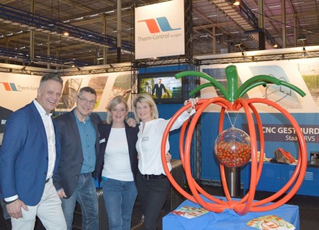 John van Hagen, Mart van Zeijl, Tineke Jas en Simone van Hagen van Therm-Control Buigen naast het kleine broertje van de grote tomaat die het beursplein voor de hoofdentree bij de Evenementenhal siert.
