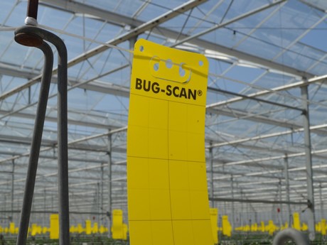 "Wij adviseren 40 gele Bug-Scan vangplaten per hectare", vertelt Nick Nagels, adviseur bij Biobest. Daarmee kan de teler de ontwikkeling van de plaag goed monitoren. Wekelijks controleren is natuurlijk nodig. Telers besparen tijd met het nieuwe, geïntegreerde ophangsysteem. Voorheen moest de teler de vangplaten knopen en draaien, nu kan hij in één handeling de plaat aan de draad bevestigen. Dat kost minder arbeid."