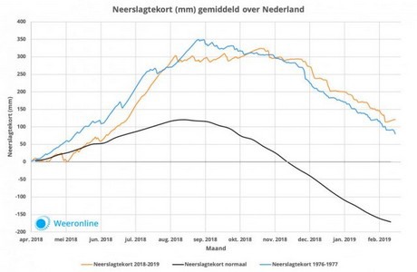Het droge jaar 2018 laat zijn sporen na. Nog steeds heeft ons land te maken met een flink neerslagtekort en de droogte is zelfs erger dan in de winter van 1976-1977. Gemiddeld over heel Nederland is sinds april 2018 121 mm minder neerslag gevallen dan verdampt. Normaal is er in deze tijd van het jaar een overschot van 171 mm. Met droog en vrij zonnig weer in het vooruitzicht wordt het neerslagtekort alleen maar groter.