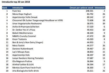 Volgens IRI spelen succesvolle introducties in op bewuste voeding en smaaksensatie. "Bewust in de vorm van minder calorieën, minder suiker en minder kunstmatige toevoegingen en juist meer eiwitten en plantaardige voeding. Smaaksensatie zien we terug in combinaties van bijzondere smaken, maar vooral ook combinaties van verschillende texturen", aldus de analyse van IRI. Fuze Tea van Coca-Cola is daarin de onbetwiste winnaar geworden, met een omzet van wekelijks 250.000 euro kwam het op plek 5 van beste introducties van de afgelopen 19 jaar terecht.