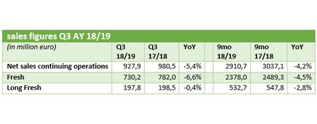 Vooral in het segment Fresh werd omzetverlies geleden. Met een resultaat van 730,2 miljoen euro viel de omzet 6,6% lager uit dan in het derde kwartaal van het voorgaande jaar. Toen werd 782 miljoen euro omzet geboekt. Over de eerste negen maanden van het jaar komt de omzet ook lager uit, namelijk op 2,378 miljard euro tegen 2,489 miljard euro een jaar eerder. Dat is een daling van 4,5%.