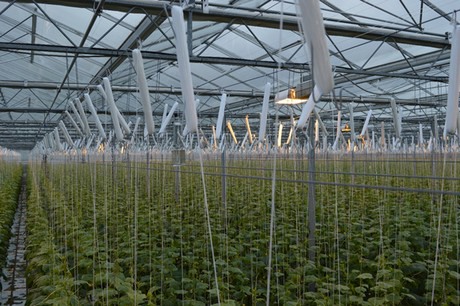 Marco van Overbeek (Gardener’s Pride) en Joris van Calcar (Lankhorst Yarns) in de kas waar Gardener’s Pride sinds dit jaar op verzoek van Albert Heijn komkommers teelt.