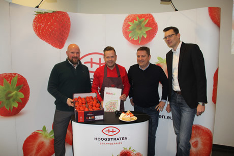 V.l.n.r. Ghesellen van de Aardbei, Jef Van Echelpoel (aankoopverantwoordelijke Delidis), Gaston Opdekamp (Directeur Coöperatie Hoogstraten), Erika Danckaers (Ups & Downs), Maaike Cafmeyer (ambassadrice Ups & Downs)