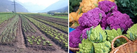 Links: Groenten in Imst, Rechts: kleurrijke bloemkool