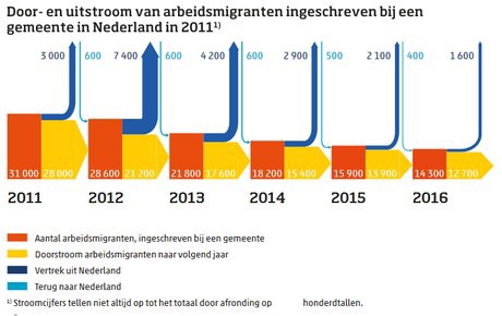 Uit ander onderzoek van het CBS blijkt verder dat van de arbeidsmigranten die in 2011 ingeschreven stonden (ruim 31 duizend) 59 procent eind 2016 Nederland weer had verlaten. Ongeveer 3 duizend arbeidsmigranten bleven korter dan een jaar in ons land: bijna 10 procent van de groep die in 2011 binnenkwam. In het tweede jaar verliet de grootste groep arbeidsmigranten Nederland.