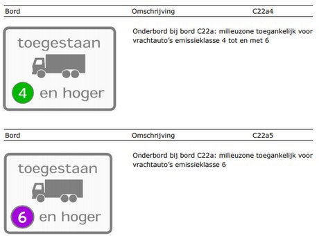 Voor vrachtverkeer bestaat er maar één bord: dat waarop staat dat alleen vrachtauto's met minimaal emissieklasse Euro 4 de milieuzone mogen inrijden ('de groene milieuzone'). In 2022 komt er een nieuw bord, waarop staat dat alleen vrachtauto's met minimaal emissieklasse Euro 6 de milieuzone mogen inrijden ('de paarse milieuzone').