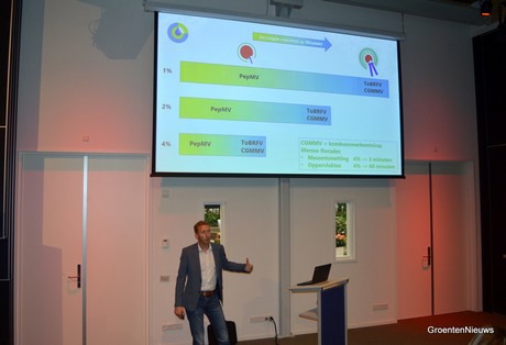 Waar moet zo’n hygiëneverantwoordelijke dan oog voor hebben? Denk aan de contact- en inwerktijd van middelen. “Even de handen inspuiten bij het betreden van de kas is bij lange na niet genoeg. Ook het even dompelen van messen in een ontsmettingsmiddel is niet genoeg. Zeker bij ToBRFV, maar ook voor het komkommerbontvirus dat eveneens uit de tobamohoek komt en dus zeer persistent is, is het eerder een kwestie van minuten dan van seconden als het om ontsmetten gaat. En sowieso: altijd eerst reinigen”, gaf Jan Willem de zaal mee. En meten, want werkt de ontsmettingsmat na verloop van tijd nog wel?