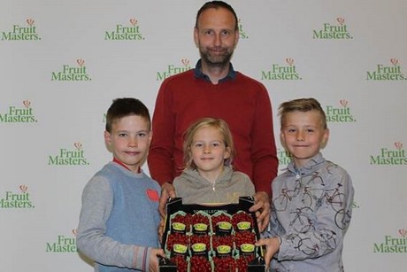 Raf Rombouts en zijn kinderen met de eerste Junifer rode bessen