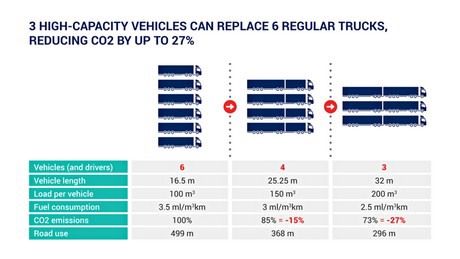 Uit praktijkervaringen met LZV’s en super LZV’s blijkt dat deze veel efficiënter, productiever en milieuvriendelijker zijn dan reguliere vrachtauto’s. Vier ecocombi’s kunnen dezelfde hoeveelheid lading vervoeren als zes reguliere combinaties. In het geval van de SEC zijn daar slechts drie combinaties voor nodig. De totale CO2-besparing bedraagt maar liefst 27% respectievelijk 15%. Bijkomend voordeel is dat er ook veel minder chauffeurs nodig zijn.