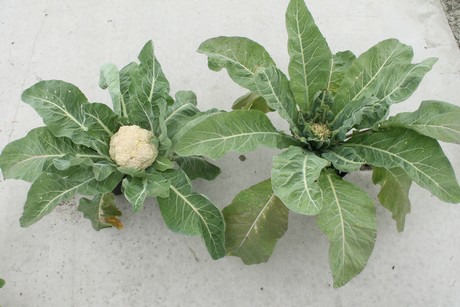 Aneuploïdie in Brassica. Links een goede plant en rechts een plant met een extra chromosoom dat zorgt voor afwijkende groei en geen koolvorming