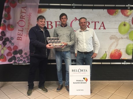 Vandaag werden de eerste Belgische blauwe bessen van het seizoen 2019 geveild bij BelOrta. Deze bessen zijn van de variëteit Duke. Het eerste kistje van 12x125g, geteeld op substraat in een verwarmde serre, werd geleverd door producenten Albert & Maarten Royakkers uit Kinrooi en aangekocht door koper Bouvry uit Brugge.