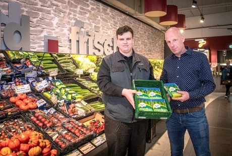 Sales manager Jarno Houben overhandigt met veel trots de eerste plasticvrije verpakkingen aan AGF-Manager Herr Marks van Edeka Jansen in Baesweiler.