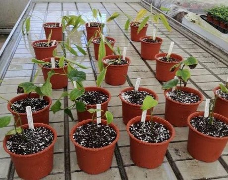 Zwartepeperplantjes (voorste 2 rijen) en kurkumaplantjes (achterste 3 rijen) die gebruikt worden voor het onderzoek van studenten Toegepaste Biologie