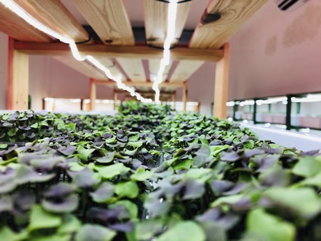 De binnen- en verticale teelt van microgroenten vindt plaats door eenvoudige schappen in een gecontroleerde omgeving op het gebied van licht, vochtigheid, ventilatie en temperatuur."