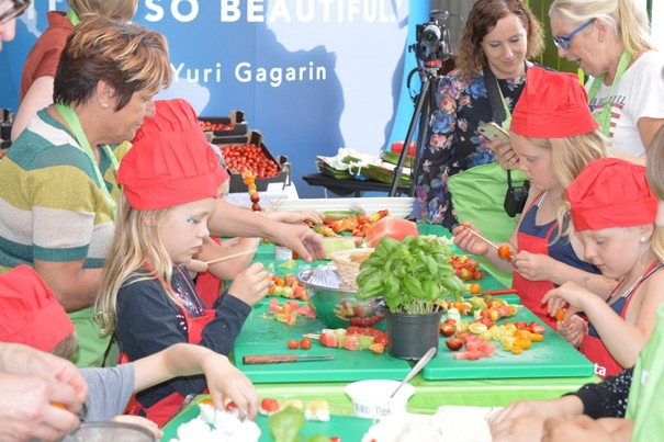 Na de korte uiteenzetting in de kas verhuisde de groep naar de keuken in het Tomato World. Marnix van Benschop, chefkok, vertelde over allerlei toepassingen van tomaten. En daarna …. aan de slag. De kids werkten geconcentreerd gestaag door. Alle kleuren snoeptomaten zorgden voor fantastische culinaire creaties.